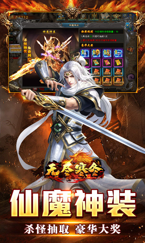 《无尽寒冬(仙魔爆充爽爽爽)》超变单职业版本强势来袭!御剑修仙杀怪加攻击,剑魂附体暴伤飙升,嗜血修罗杀怪加血量,修罗附体强势抗伤,两大流派战至巅峰!大陆神器现世,助你战力狂飙横扫千军,刷怪获取抽奖次数,大量福利、仙魔神装等你抽取!还有福利BOSS、剑指沙城等丰富玩法系统等待体验,速速集结兄弟,战个痛快!